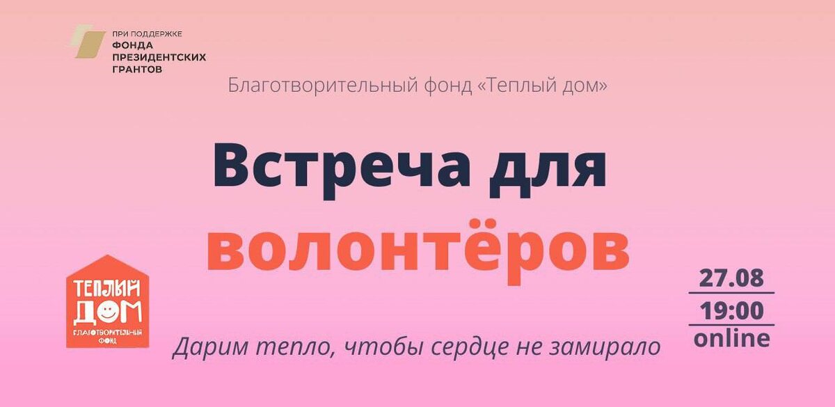 Дорогие друзья! Мы приглашаем вас на онлайн-встречу фонда «Теплый дом» в рамках проекта «Дарим тепло: поддержка семей с детьми в кризисной ситуации и помощь в преодолении последствий пережитых травматических событий», который реализуется с использованием гранта Президента Российской Федерации, предоставленного Фондом президентских грантов. Эта встреча открыта для всех — для тех, кто уже помогает с нами, для тех, кто только задумывается о волонтёрстве, и для наших бывших подопечных семей, которые знают, как важна поддержка в трудный момент. На встрече мы: ▶️ познакомимся и расскажем о проекте фонда; ▶️ поделимся, где особенно нужна помощь волонтёров и как вы можете включиться; ▶️ отдельно остановимся на теме репетиторской поддержки: как формируются пары «волонтёр – ребёнок», какие есть правила и форматы занятий; ▶️ поговорим про взаимодействие с родителями и фондом; ▶️ обсудим, что же такое драматические изменения в жизни и как они влияют на будущее детей и семей; ▶️ ответим на ваши