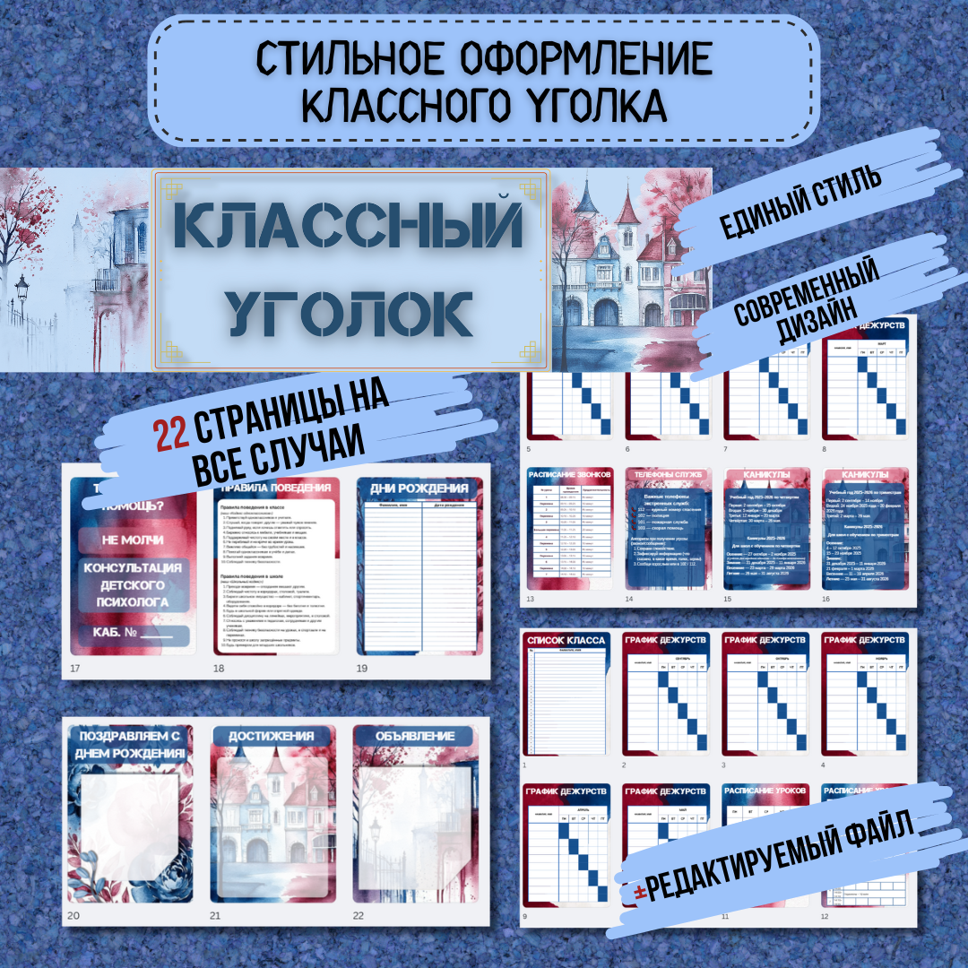 Классный уголок всегда был и остаётся неотъемлемой частью школьного пространства. Он помогает организовать жизнь класса, информировать учеников и родителей, создавать атмосферу уюта и единства. Однако у каждого классного руководителя есть проблема: оформление уголка отнимает много времени, а готовые варианты из интернета часто выглядят устаревшими или не подходят по стилю. Сегодня всё чаще педагоги ищут современный и функциональный классный уголок, который можно сразу распечатать и разместить в кабинете. Особенно актуально это для молодых учителей и родителей, которые хотят, чтобы оформление выглядело стильно и гармонично. Таким образом, грамотно оформленный уголок становится помощником педагога в воспитательной работе. Учителю приходится самостоятельно искать картинки, продумывать дизайн, подгонять всё под формат печати. Часто оформление выходит слишком «пёстрым» или, наоборот, скучным. К тому же, при ежегодной смене учеников нужно обновлять материалы. Здесь и приходит на помощь готов
