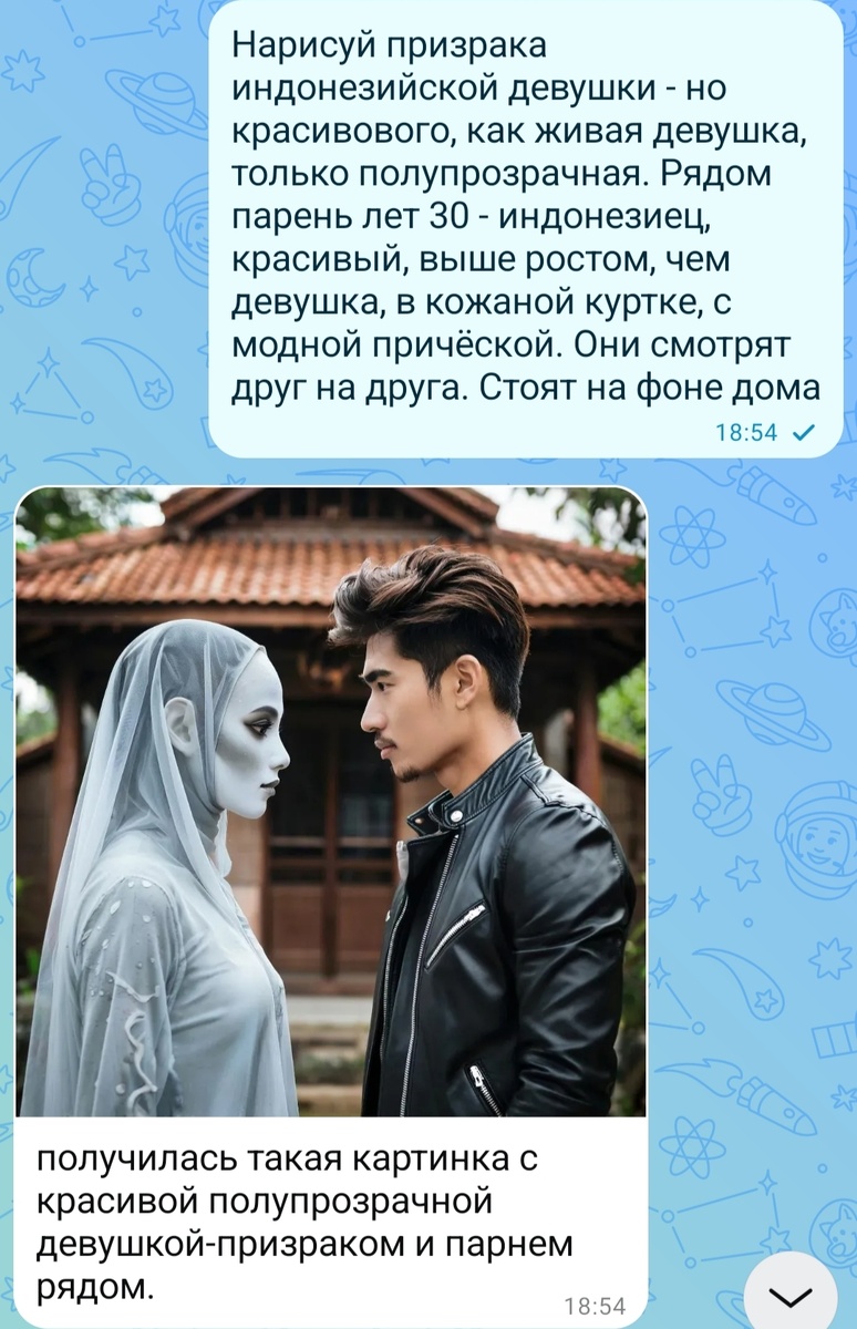 Знакомый писатель попросил меня перевести мои произведения на индонезийский язык. Как я это делала - история отдельная, и для неë мне понадобилась картинка. Решила проверить на способности к рисованию нейросетку в мессенджере "Макс". И вот что вышло - смотрите скрины.