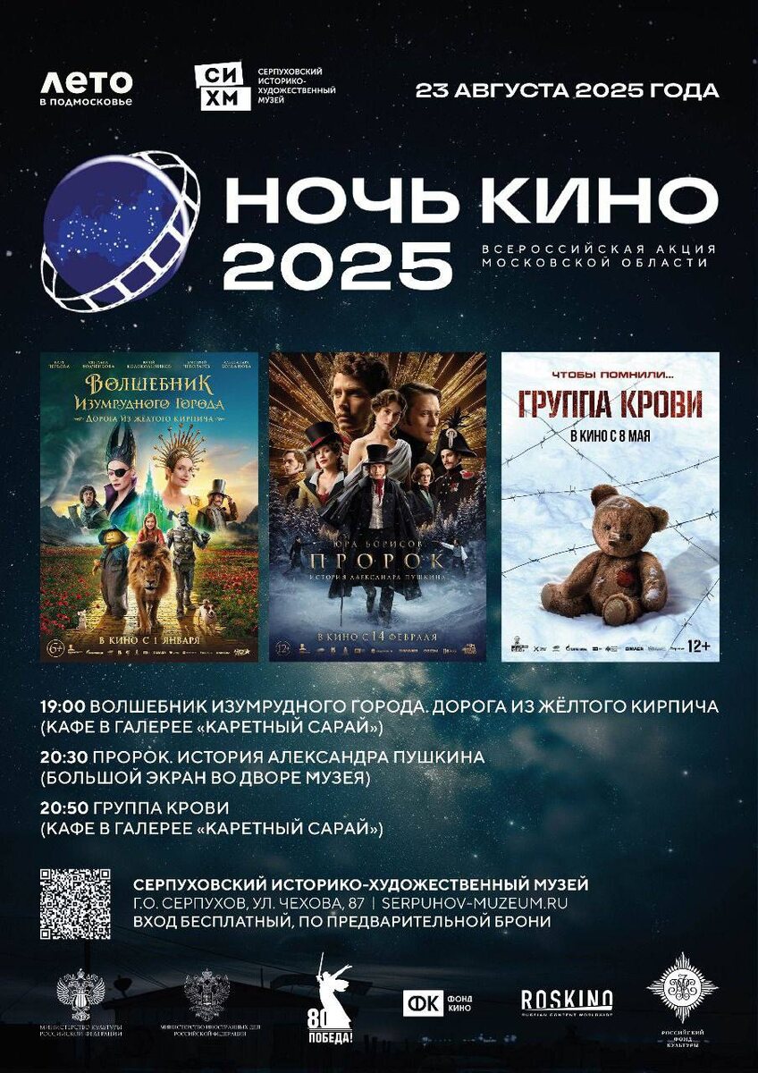 ✨ Ночь кино в музее 🎬19:00 — «Волшебник Изумрудного города. Дорога из жёлтого кирпича» 6+ 🎬20:30— «Пророк. История Александра Пушкина»12+ 🎬20:50— «Группа крови» 12+ Вход свободный, по предварительной регистрации👉 https://clck.ru/3NkJPe 📆 23.08.2025 🏢 Серпуховский историко-художественный музей 📍 Московская обл., г. Серпухов, ул. Чехова, д. 87 ⭐Разместить публикацию ⭐Поддержать канал голосом 💰 Стань курьером в Серпухове – твой доход, твое время! ✅ Мероприятия Серпухов https://dzen.ru/id/66f01c6eb4c6fe60c9ca1608 http://vk.com/serpukhov_events http://dzen.ru/serpukhov_events