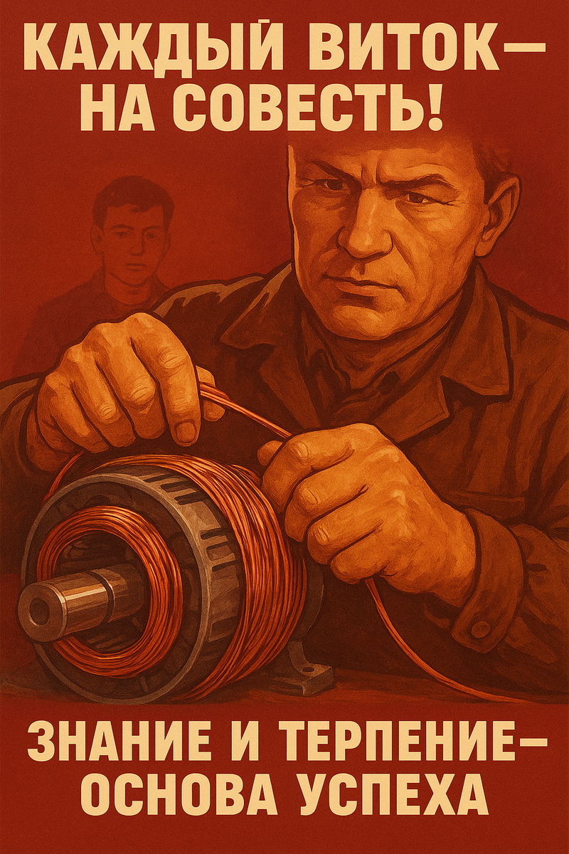 Мне в тот день достался двигатель от кран-балки — старый, почерневший от времени и усилий, но все еще полный скрытой силы. Вроде бы и не самый сложный агрегат, но он требовал ювелирной работы — полной перемотки обмоток. Я устроился на своем рабочем месте, окруженный верстаками и инструментом, и принялся аккуратно, с почти хирургической точностью, вытаскивать старую, почерневшую медь. Воздух быстро наполнился едким, сладковато-горьким запахом жженого лака — запахом, от которого слезились глаза и першило в горле. Рухи быстро стали черными, пальцы заныли от мелкой, кропотливой работы, но сознание было полностью поглощено процессом. Это была та самая работа, где нельзя торопиться, где каждый виток — это шаг, каждое движение — решение.