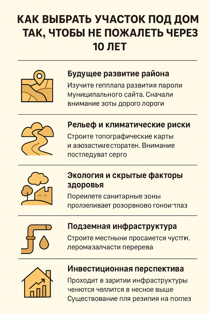 Многие покупатели загородных участков думают о сегодняшнем дне: удобно ли добираться, есть ли свет и газ, подходит ли цена. Но дом — это проект на десятилетия. Ошибка в выборе земли может превратить мечту в проблему, которую не решит ни ремонт, ни перепланировка. Давайте разберём ключевые факторы, которые редко учитывают, но именно они определяют, насколько комфортной будет жизнь в будущем. То, что сегодня выглядит тихим полем, завтра может стать стройплощадкой трассы или промышленного объекта. Ошибка многих покупателей — оценка только текущего окружения. Но через 10 лет ваши окна могут выходить не на поле, а на оживлённый шоссе. Сегодня участок сухой, но через пару лет в низине соберётся вода, а весной начнёт топить подвал. Чистый воздух сегодня — не гарантия завтра. Часто покупатели смотрят только на наличие электричества. Но через годы главными проблемами становятся: Совет: спросите у жителей, сколько реально платят за коммунальные услуги и бывают ли перебои. Это лучше любой рекламы