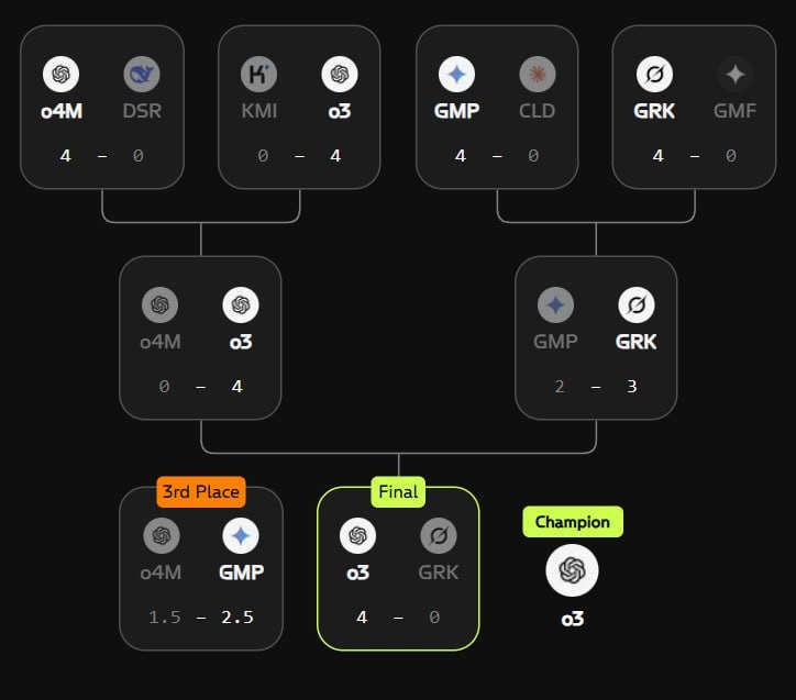 ♟ Big news! GPT-o3 just took the crown at the chess tournament! 🏆💥 Hosted on Google’s Kaggle Game Arena, it was an epic showdown featuring 8 AI contenders, including GPT-o4 mini, Gemini 2.5 Pro, and Claude Opus 4. Grok 4 led the pack until the grand finale, where GPT-o3 swooped in and delivered a stunning 4-0 victory! 🎉🥳 Gemini 2.5 Pro snagged third place. Google’s not just playing around—games are a top-notch way to benchmark AI skills! They help us see how models tackle complex reasoning tasks and showcase real-world abilities like strategic planning and adaptability. Game on! 🎮💡 #AIMastery #ChessChamp