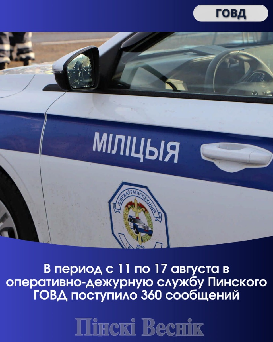 🤍В период с 11 по 17 августа в оперативно-дежурную службу Пинского ГОВД поступило 🤍360 сообщений, из которых 🤍47 касаются уголовного
