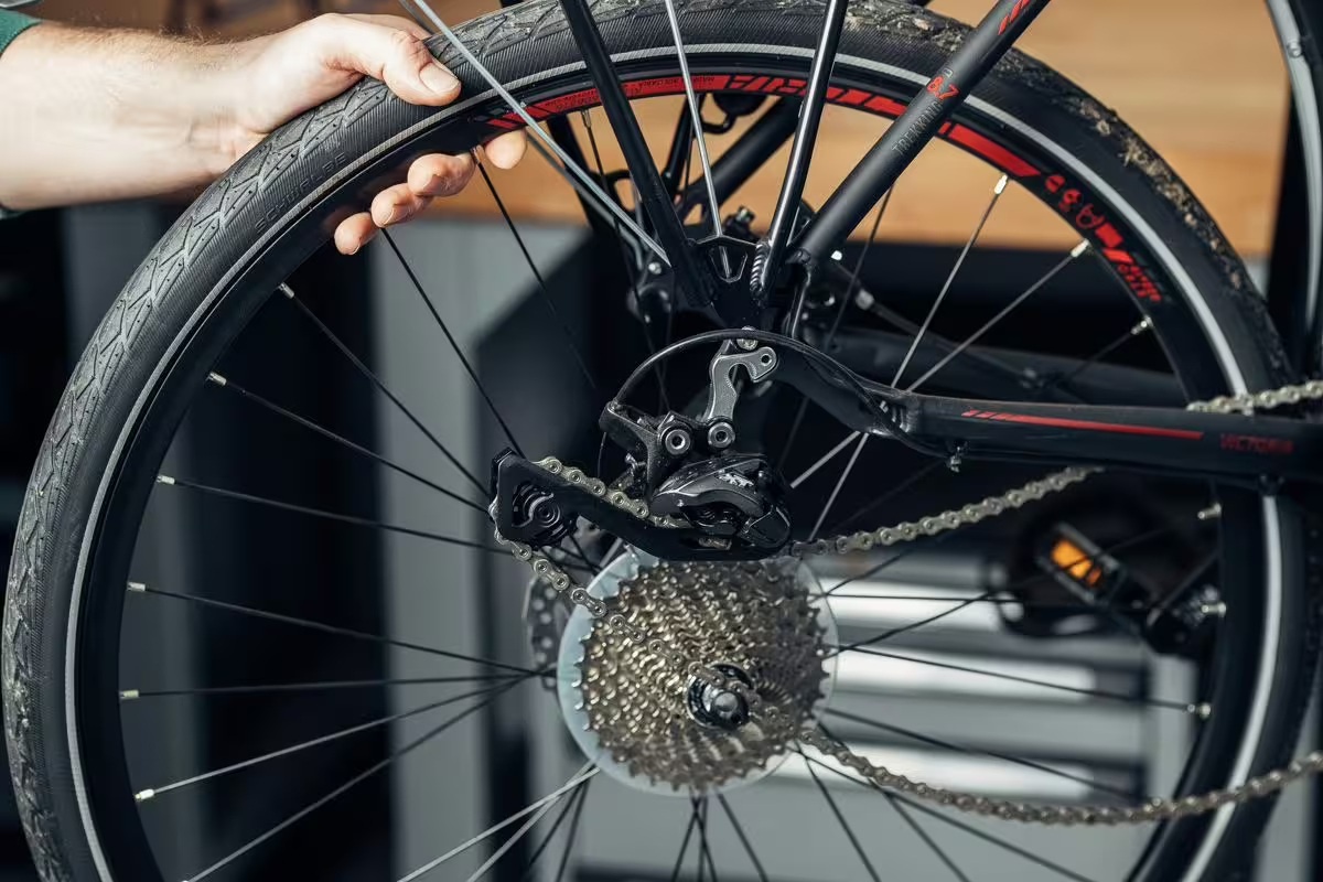 Самая эпичная битва. Ты будешь одной рукой оттягивать переключатель, другой — пытаться впихнуть колесо и молиться, чтобы ротор вошел ровно в щель калипера. Затем надень цепь на самую маленькую звезду кассеты, аккуратно вставь ротор тормоза в калипер и сдвинь переключатель вперед. Закройте эксцентрик — все!