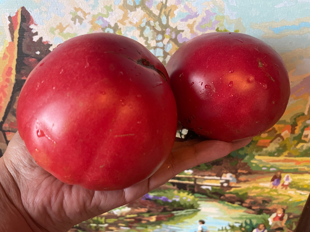 Покажу еще один сорт, который смог в этом сезоне порадовать меня вкусными помидорами. Описание сорта: Семена томата редкого коллекционного сорта Португальский Монстр Майкла (Michael's Portuguese Monster). Индетерминантный, высокорослый (до 1.8м), мощный сорт, среднего срока созревания. Плоды тёмно-розовые, округлые и плоскоокруглые, с небольшой ребристостью и гранями, все очень крупные, массой 400-700 гр. и более. Мякоть бифштексного типа, мясистая, сладкая, с малым количеством семян. Отличный сорт для нарезки, свежего потребления, соков и томатной пасты. Болезнеустойчивый сорт. Вести в 1 ствол с обязательной подвязкой. Для теплиц и ОГ. Сорт отлично растет и теплицах и в ОГ. У меня вырос так: Высадила переросшую рассаду в открытый грунт 17 мая. Выращивала 1 растение этого сорта. Формировала в 1 стебель. Около одной опоры росли 3 разных томата. Растение сильное. Высота примерно 1,8 метра. Незрелые помидоры сорвала 7 августа. На кусту выросло 4 штуки. Два на первой кисти и два на вто