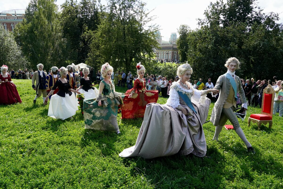 По всему парку шли артисты в костюмах восемнадцатого века, создавая иллюзию настоящей имперской церемонии. Императорская процессия двигалась по дорожкам сада, окруженная восторженными зрителями.