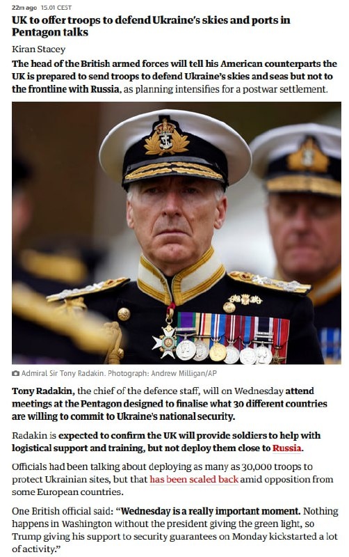 Chief of British armed forces heads to Pentagon with proposal ready to send troops to guard Ukraine’s skies and ports but 'not to the frontline' Talks with 30 countries on ‘postwar security guarantees’ Initial 30,000-strong plan already watered down after internal EU pushback
