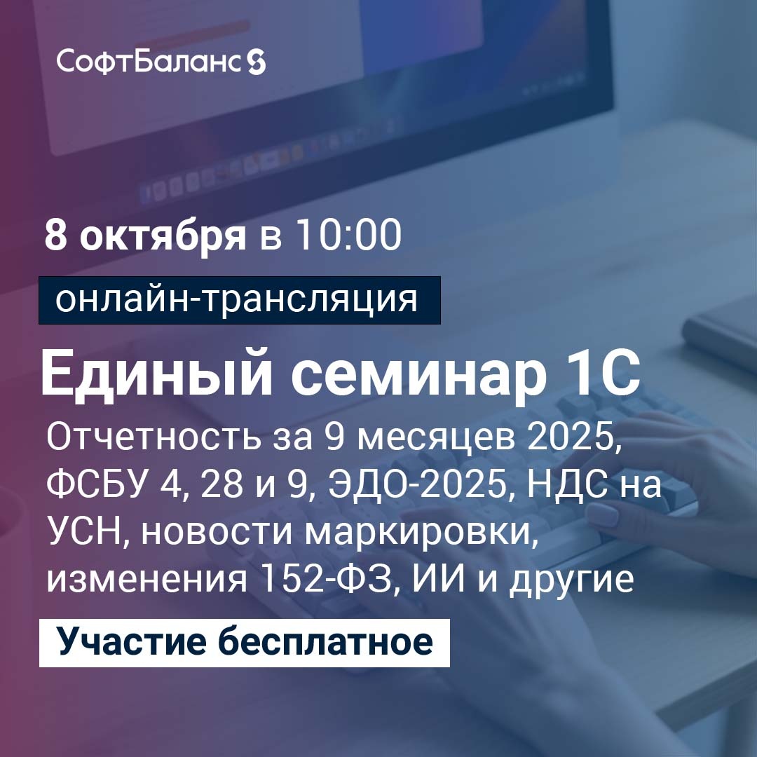 Фирма "1С" и группа компаний "СофтБаланс" приглашают принять участие в Едином семинаре 1С, который пройдет 8 октября 2025 года (среда) в 10:00 в формате онлайн-трансляции.