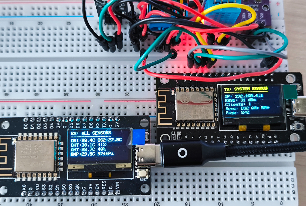 Проект представляет собой автономную беспроводную систему для мониторинга ключевых параметров окружающей среды. Система состоит из передатчика, оснащенного комплексом датчиков, и приемника с дисплеем для отображения данных. Устройства работают по принципу прямого WiFi-соединения без необходимости подключения к интернету или роутеру. Готовая плата уже содержит: Простое подключение датчиков: Питание: Все датчики подключаются к 3.3V и GND платы Система позволяет сравнивать показания 4 разных температурных датчиков и 2 датчиков влажности, что обеспечивает высокую достоверность данных. Циклическое переключение между страницами позволяет отслеживать как текущие показания, так и системную информацию. К одному передатчику могут подключаться несколько приемников, что позволяет создавать распределенные системы мониторинга. Проект представляет собой готовое решение для профессионального и бытового мониторинга параметров окружающей среды с открытой архитектурой и большим потенциалом для модификац