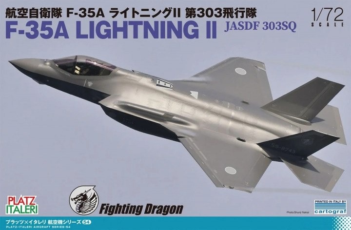 Platz из Японии перепаковала со своей декалью модель F-35A Lightning II в масштабе 1/72 разработки Italeri 2013 года: F-35A Lightning II JASDF 303SQ "Fighting Dragon" (каталожный номер TPA-54)