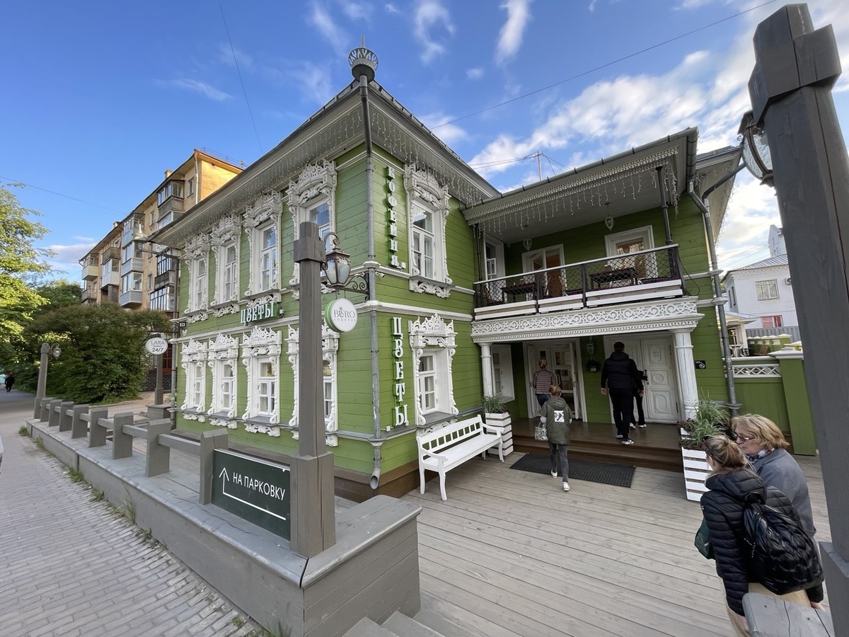 Вот этот вот дом - со счастливой судьбой, к нему не прилетел «красный петух», как ко многим его собратьям, он отремонтирован, и принимает посетителей: внутри кафе и цветочный магазин. Фирма Лара, местная, вот как раз этом и занимается, ремонтирует уже который Вологодский характерный деревянный дом и в нём размещает свои цветы и кофейные чашки ☕️