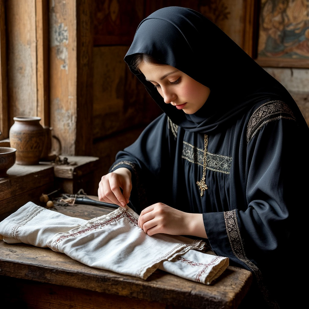 Между тем, Соломония успокоилась, села обратно, собрала упавшие лоскуты, и снова принялась за шитье.