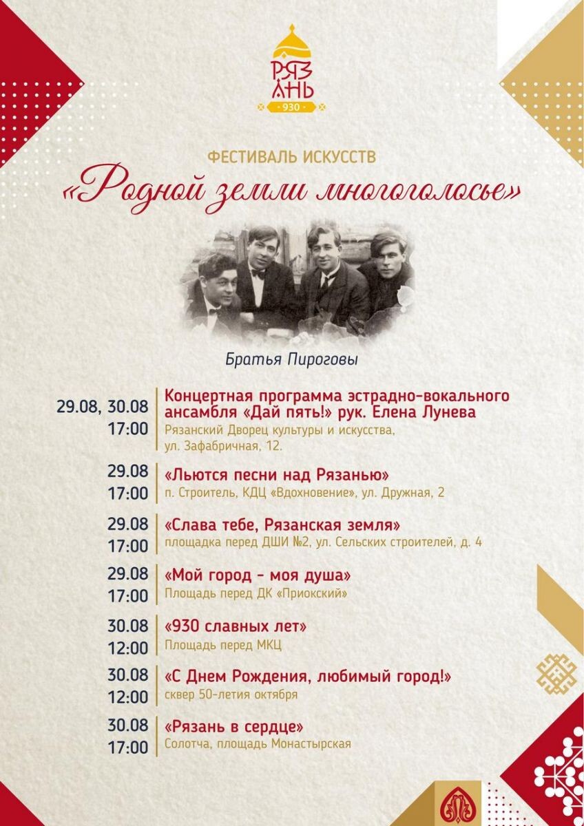 29 и 30 августа город Рязань отметит своё 930-летие масштабным фестивалем «Родной земли многоголосье». Это событие посвящено памяти выдающихся братьев Пироговых, чьи достижения в музыке стали частью истории не только Рязани, но и всей России. Все пятеро братьев, Григорий, Михаил, Иван, Алексей и Александр, обладали выдающимся басовым голосом. Трое из них прославились как солисты Большого театра. Александр Пирогов, наиболее известный представитель династии Пироговых, на протяжении 30 лет был ведущим басом Большого театра. В дни празднования 930-летия Рязани в разных районах города пройдут концерты лучших творческих коллективов и солистов Рязани и области: 30 августа в 12:00 на площади перед Муниципальным культурным центром пройдёт концертная программа «930 славных лет». В это же время на площади перед Рязанским Дворцом культуры и искусств будет выступать коллектив с концертом «Любимый город». На праздничных мероприятиях будут организованы мастер-классы для детей, анимационные программы,