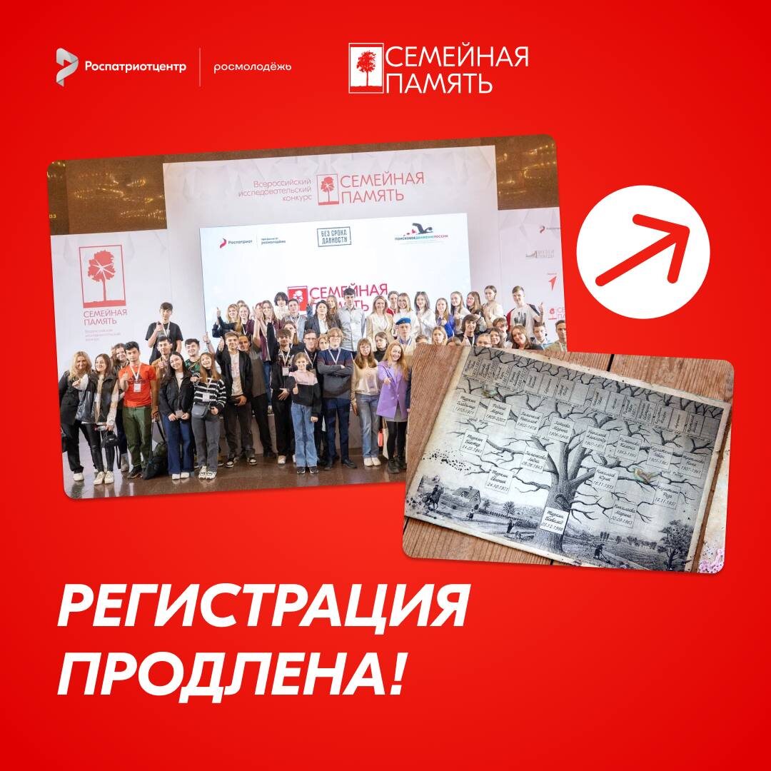 Регистрация на «Семейную память» продлена! Крайний срок регистрации – 24 августа! ✔️ Напомним, Всероссийский исследовательский конкурс проходит в двух номинациях – «Исследовательский проект» и «Творческий проект». Вы можете создавать свои работы в абсолютно разных форматах: презентации, эссе, фотографии, видеоролики — всё, на что способна ваша фантазия! Давайте изучать историю наших семей и хранить память вместе❤️ ❤️ Подписывайтесь на Роспатриот