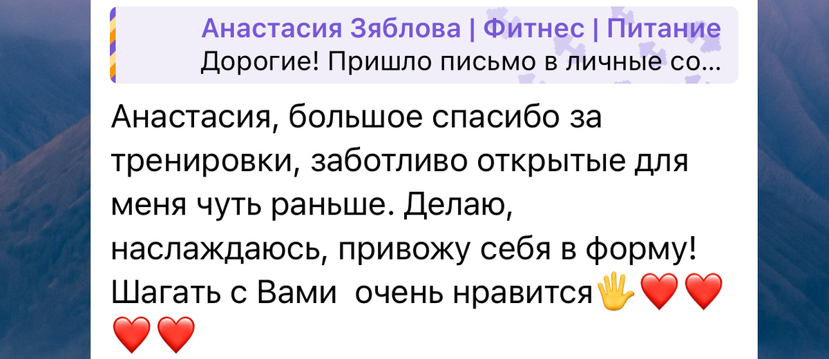 Мы все знаем, что с возрастом обмен веществ замедляется, энергии становится меньше, а времени на заботу о себе — ещё меньше. Особенно если большая часть дня проходит за компьютером или в заботах о семье. Кажется, что на спорт просто нет ни сил, ни времени. Но хорошая новость в том, что для того, чтобы чувствовать себя бодрой, стройной и красивой, вовсе не обязательно проводить часы в спортзале. Достаточно шаг за шагом возвращать движение в жизнь. И один из самых простых и эффективных способов для этого — интервальная ходьба с упражнениями. Почему именно ходьба + упражнения? Многие женщины после 40 сталкиваются с тем, что обычные тренировки кажутся слишком тяжёлыми, а простые прогулки — слишком лёгкими. Именно поэтому я создала методику, где 30 секунд активной ходьбы чередуются с 30 секундами простых упражнений. Что это даёт: Пробная тренировка на 20 мин тут ⬇️ Как это выглядит на практике Представьте: вы включаете тренировку, встаёте со стула после рабочего дня и начинаете шагать н
