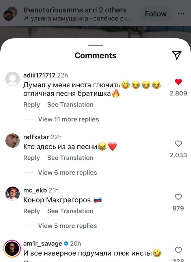 Сегодня у 1000 россиян случился культурный шок: в запретграм-аккаунте ирландского аса ММА Конора Макгрегора внезапно заиграла... русская песня! Многие подумали, что ловят баги, но нет — это оказался жест уважения от самого Конора в сторону России. Респект МакГрегору за такой неожиданный и крутой ход! Конор славился такими полутонами, когда он не в лоб выказывает позицию, но считывается то, что он хочет донести Круто, что наша культура и музыка рушат границы даже в мире жестких ребят с октагона. Это конечно не Матушка Земля, но произведение довольно лиричное. Респект "бойцу" информационной передовой!😁 Фонд Звезда - про помощь и эксклюзивы. Сам читаю и всем советую😎