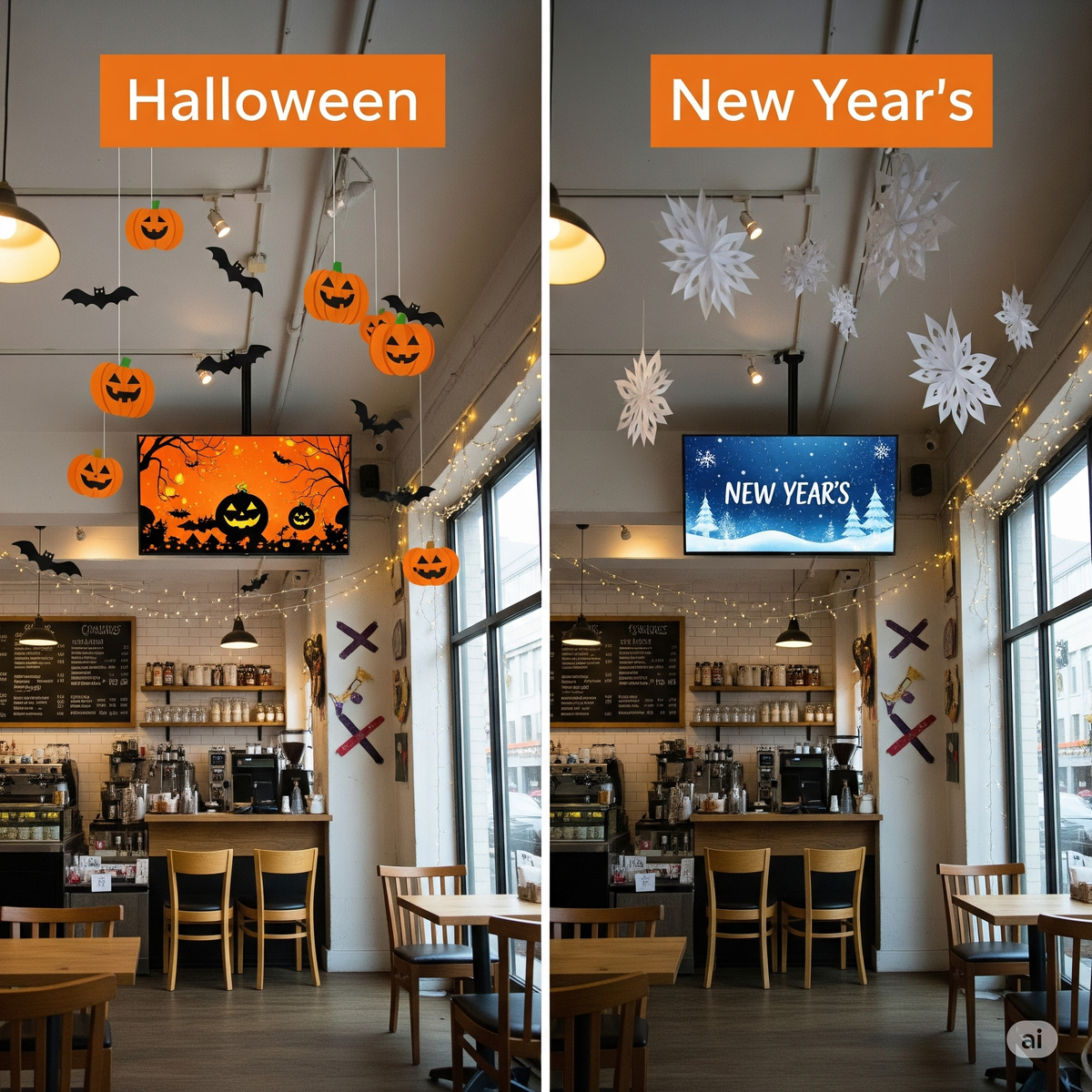 Приближаются праздники, а это отличный повод привлечь больше гостей! Но что делать, если на полноценный декор нет ни денег, ни времени? Вот 5 простых и дешевых способов быстро создать праздничное настроение в вашем кафе. 1. Начните с окон.