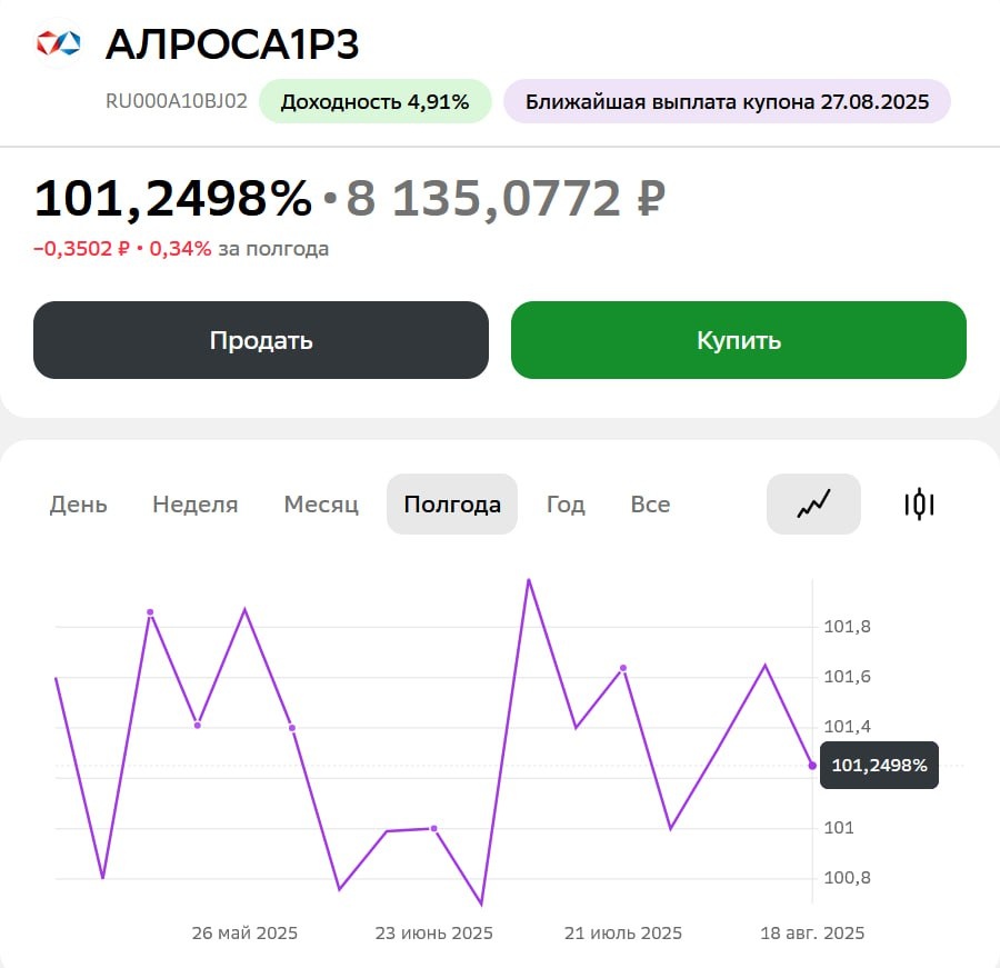Маленькая милая валютная облигация Может быть я уже упоминал, но сейчас не нашёл когда и где (тут или в видео), поэтому на всякий случай ещё раз обращаю внимание на редкое открытие среди валютных облигаций: АЛРОСА1Р3 Чего в ней примечательного? А то, что её номинал всего 100$. Обычно это 1000$. Кому это может быть интересно? Например тем, кто уже вложился и только докупает на текущие купоны и дивиденды валютные облигации. Вот смотрите, пришли вам например 12т руб дивидендов от Яндекса. Потом ещё купоны с одной из ОФЗ на 20 т, следом дивиденды от Роснефти итд… И как вы будете покупать замещайки? Ждать пока не накапает свыше 85 т руб? (1000$ x курс + НКД). А если вы не хотите ждать неделями, а хотите, чтобы деньги работали? Брокеры и Мосбиржа и так жиреют на наши не использованные деньги на брокерских счетах... А тут вы можете 1 лот уже за 8т руб с копейками приобрести, как видно со скрина. Хорошего дня! Пошёл докупать)) Не является ИИР. Ваши Деньги – Ваше Дело!