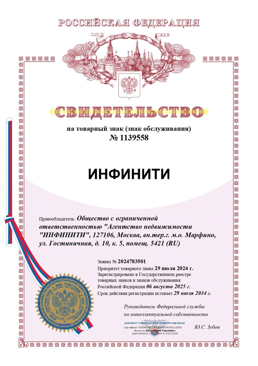 МЫ ПРОДОЛЖАЕМ РАСШИРЯТЬ ГОРИЗОНТЫ! Отличные новости! Компания «Инфинити» официально получила государственное свидетельство на товарный знак. Теперь наше имя защищено законом! Этот шаг подтверждает наши исключительные права на использование бренда и является важной частью нашей стратегии по построению надежного и узнаваемого бизнеса. Мы масштабируемся, растем, усиливаем позиции на рынке недвижимости, становимся сильнее — чтобы каждый, кто выбирает нас, получал максимальный результат и уверенность в завтрашнем дне! #событияИнфинити