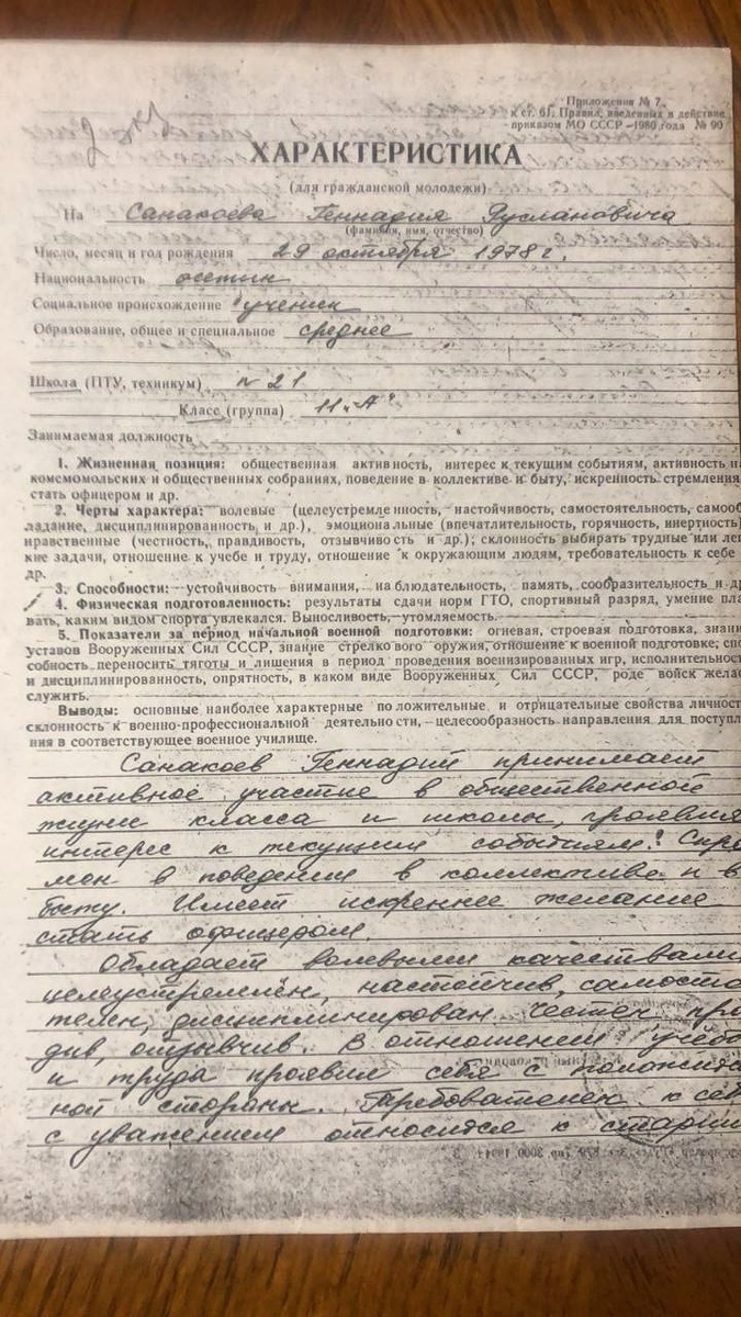 "... Обладает искренним желанием стать офицером. Склонен к военно-профессиональной деятельности. Волевой, настойчивый, честный..." Из характеристики на ученика 11"А" класса школы №21 города Владикавказа 1995 года выпуска Санакоева Геннадия Руслановича. Для предоставления в военное училище. Написано на удивление неформально, очень тепло и проникновенно. А вот эта строчка: "Гена исполнителен и дисциплинирован...". "Гена..." - это ведь совсем не бюрократический слог, а пронизанные уважением к ученику напутственные слова, чтобы приемная комиссия знала, какой он. А ведь во владикавказскую 21 школу Геннадий Санакоев приехал уже...в 11 классе. Перевелся из школы города Актау в Казахстане, когда приехал в Осетию поступать в военное училище. И вот за такой короткий срок он вызвал такое отеческое отношение преподавательского состава, который отметил его неординарные личные качества. Гена родился в поселке Дзау Южной Осетии 29 октября 1978 года и уже в возрасте 3 лет, в 1981 году переехал в Ка