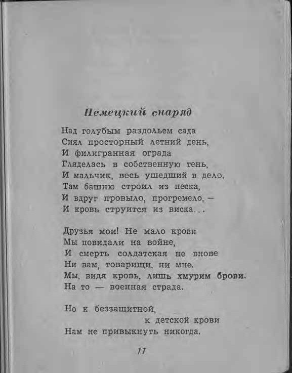Немецкий снаряд Над голубым раздольем сада Сиял просторный летний день, И филигранная ограда Гляделась в собственную тень, И мальчик, весь ушедший в дело, Там башню строил из песка, И вдруг провыло, прогремело, — И кровь струится из виска... Друзья мои! Не мало крови Мы повидали на войне, И смерть солдатская не внове Ни вам, товарищи, ни мне. Мы, видя кровь, лишь хмурим брови. На то — военная страда. Но к беззащитной, к детской крови Нам не привыкнуть никогда. Она по капельке стекает, Песок набился в детский рот. А мать... она еще не знает, Она еще волос не рвёт... А весть, что, правды не скрывая, Примчится на передний край... Не надо, почта полевая! Уж лучше в поле потеряй!.. Мне ясно виден путь снаряда. Я знаю, как он к нам попал. Сначала немцу было надо Добыть руду и лить металл. Потом, под шелестенье шкива, Его точили на станке, И мастер, выпив кружку пива, Стоял с кронциркулем в руке. Потом в снаряд брусок тротила Рука немецкая вкатила. Потом — из дальней той земли — Ег