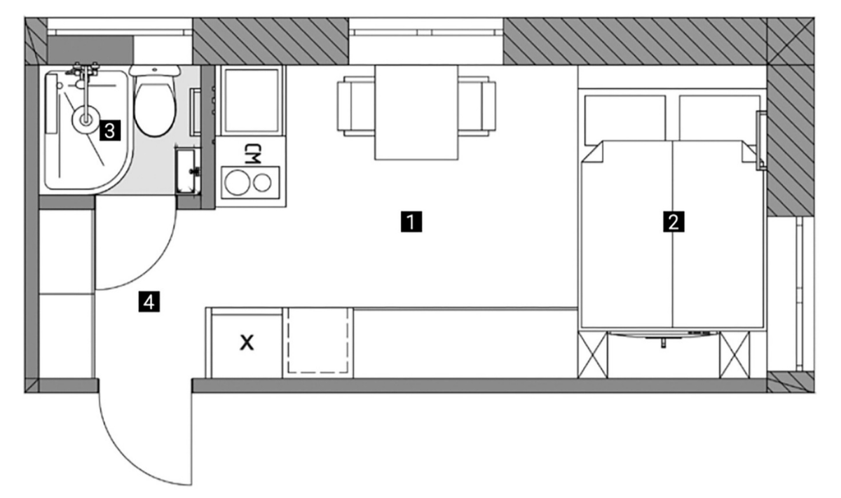 Ремонт в небольшой квартире – задача со звездочкой. А если у тебя в распоряжении всего 16 квадратов, то обустройство превращается в настоящий квест. Куда впихнуть стиральную машинку? Где разместить холодильник? Что выбрать – диван или кровать? А где хранить одежду, вещи, бытовую технику? Именно с таким ворохом вопросов столкнулась молодая хозяйка небольшой студии в центре Сочи. Квартира студийной планировки (кухня объединена с жилой комнатой) расположена в сталинском доме 1956 года постройки. До ремонта помещение было непригодно для комфортной жизни. Переночевать – запросто, а вот жить постоянно – неудобно. После ремонта результат превзошел все ожидания. На 16 квадратах удалось разместить все необходимое. Спальное место – с выдвижными секциями, кухня – со встроенной техникой. Даже санузел с душем получилось обустроить всего на 1,5 квадратах. Как сейчас выглядит эта крошка-студия – смотрите ниже. Для начала покажу планировку квартиры, чтобы представлять, где и что расположено. А так это