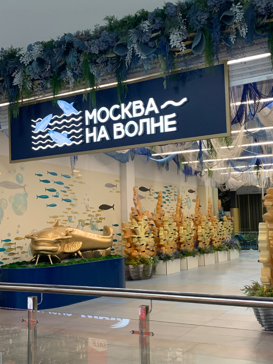 Заглянула в нашумевший рыбный рынок «Москва на Волне» в ТЦ «Глобус» в Москве. Делюсь впечатлениями — что понравилось, а что нет, и стоит ли ехать туда целенаправленно. «Москва на волне» позиционируется как рыбный рынок, но это скорее большой магазин, который находится в глубине ТЦ «Глобус». К нему ведут указатели По всему ТЦ. Оформление в сине-белых тонах, рыбные инсталляции украшают просторное помещение. Магазин состоит из двух уровней: на первом, собственно, сам рынок, где продают и жарят морепродукты. На втором фуд-корт. Длинные прилавки наполнены свежей, охлажденной и замороженной рыбы со всех регионов РФ и из-за границы, хотя, в основном, ассортимент привычный. Прям вот экзотических видов, я не заметила, разве что ракушки. А может, мы, дети глобализации, просто зажрались) Цены, стоит отметить, не ниже, чем на хороших обычных рынках, но гораздо демократичнее, чем в рыбных ресторанах. Главная фишка этого места: выбранные деликатесы пожарят при тебе. Вот ради чего точно ст