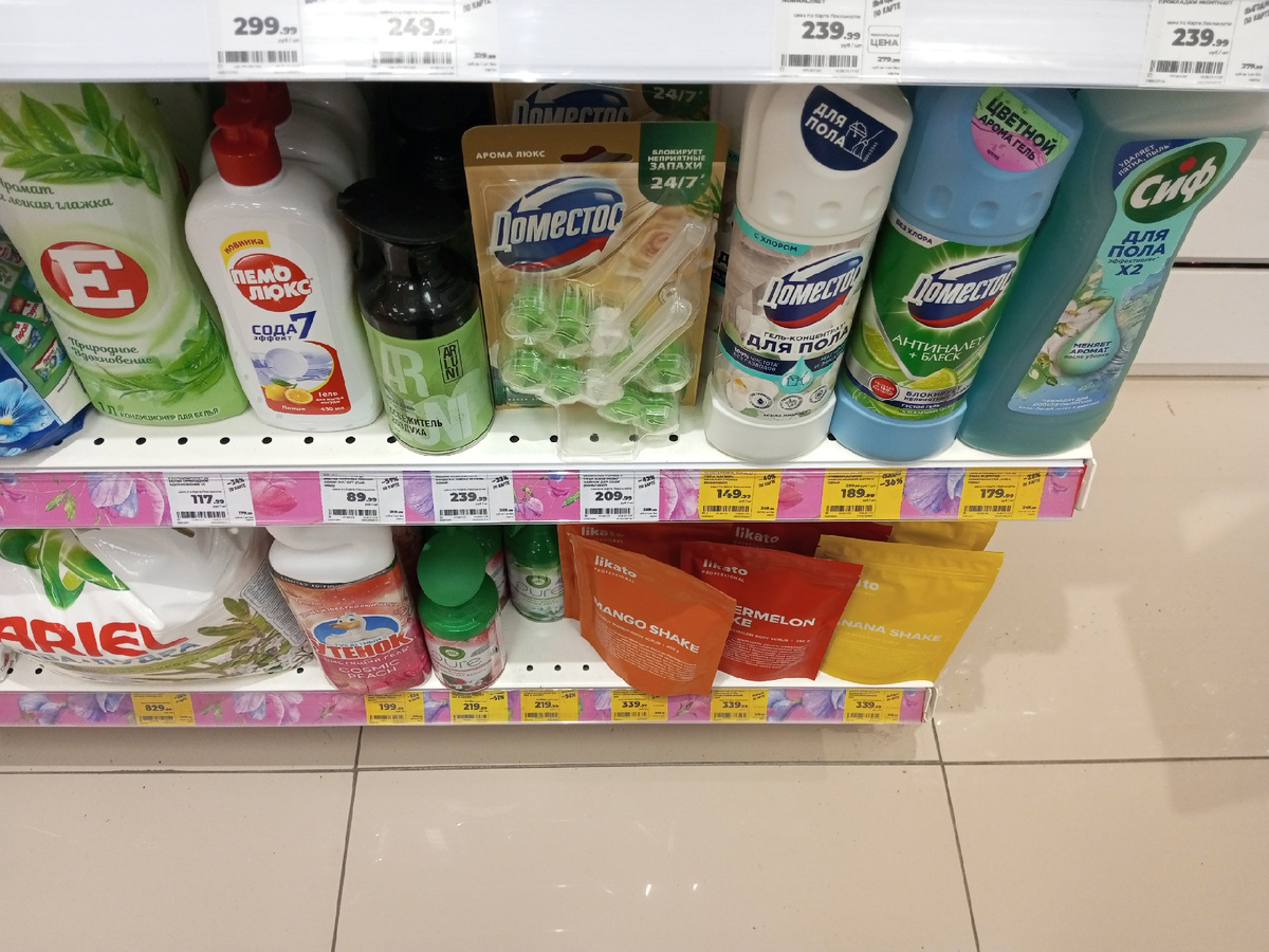 "Доместос" уже воспринимаю как нечто классическое для уборки, вижу его чуть ли не в каждом доме, да и сама покупаю время от времени. Перед нами два ценника: 149 и 189 рублей, только в первом случае это гель для пола, а во втором - универсальное средство для уборки (и это цветной аромагель, надо же). У "Сиф" появилась новинка тоже в виде средства для мытья пола - 179 рублей.