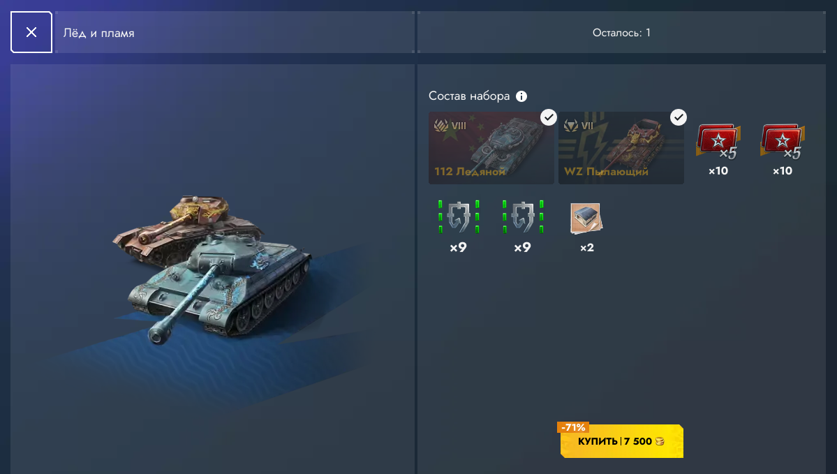 Стоимость набора 7500 голды. За эту сумму вы получаете два хороших премиумных танка, которые помимо того, что позволят вам насладиться игрой на них, буду фармить еще и серебро. Плюс ко всему у них сразу будет куплено все оборудование и еще закинуть Х5 опыта в кол-ве 10 штук. Поэтому пока есть такая возможность, брать однозначно стоит. Если вы на них наиграетесь, то они спокойно будут стоять и пылиться в ангаре, а как только вам наскучат другие танки, то на них можно снова выкатиться в бой.