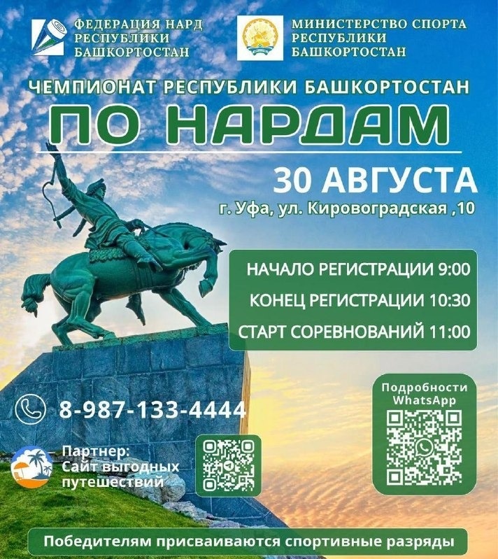 30 августа в Уфе пройдет первый республиканский чемпионат по нардам. Об этом сообщает телеграм-канал мэрии. Организатором выступает федерация нард РБ при поддержке министерства спорта РБ. Победителям будут присвоены спортивные разряды. Цель проведения – повышение популяризации занятий интеллектуальным видом спорта, развития культурного досуга среди жителей всех возрастов, привлечение спортсменов из других городов Республики Башкортостан, а также укрепление спортивных традиций города. Чемпионат пройдет по адресу: ул. Кировоградская, 10. Регистрация участников с 9.00 до 10.30, начало соревнований в 11.00. Справки по телефону: +7 (987) 133-44-44. 6+