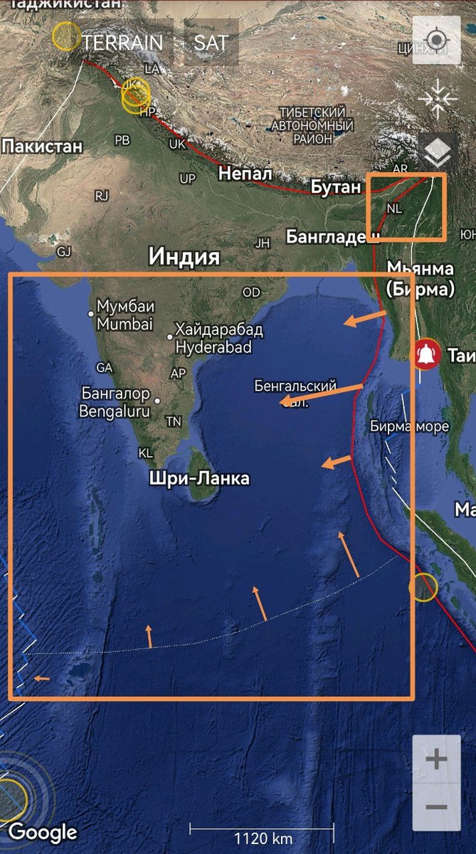 В ответ на пост При этом вчерашняя картина на юго-востоке Индостанской плиты намекает на смещение облачной проекции рифтовой зоны на северо-запад. Трассер несколько смяло в северной части, но общий "ход мыслей" планеты Земля ясен (снова на "восьмерку" целится). Сегодня произошло 3 землетрясения М4+ на стыке четырех плит (Бирманской, Сунда, Евразийской, Индостанской) - см фото 5. Причина этой сейсмической серии как раз находится со стороны подвижек Индостанской плиты.