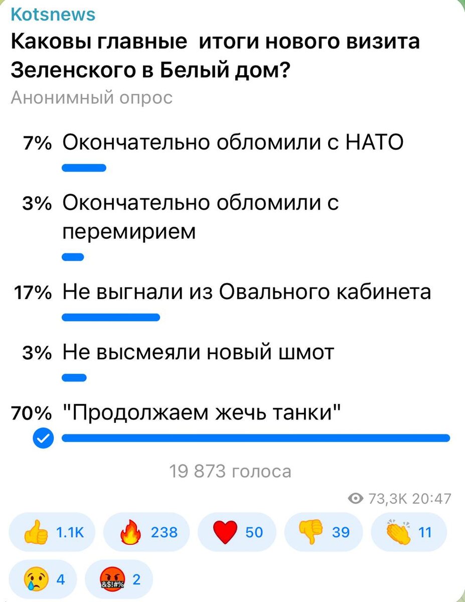 ⚡️⚡️⚡️ 70 процентов подписчиков уверены: «Продолжаем жечь танки». Свою переговорную позицию надо постоянно укреплять.