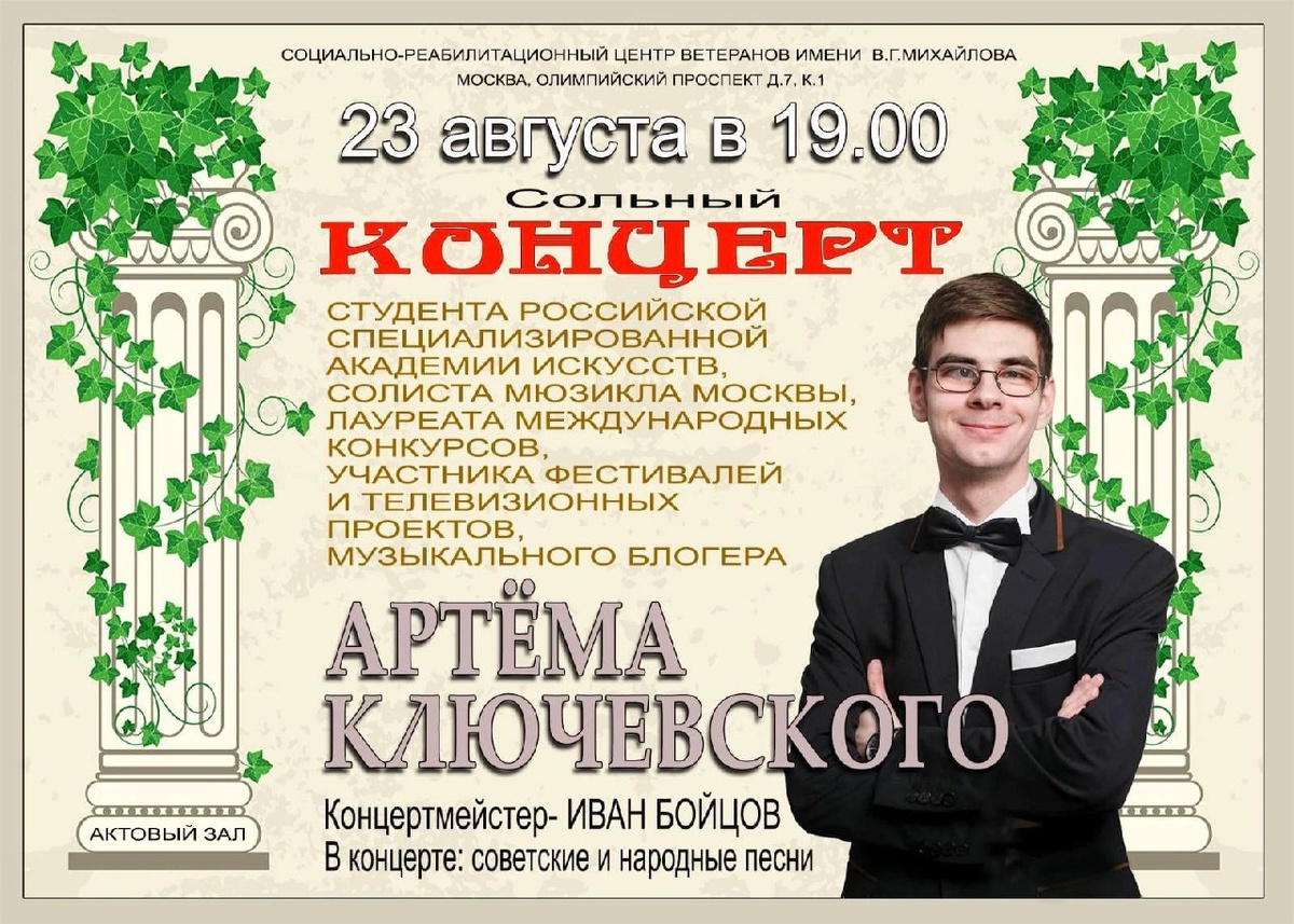 🗓️23 августа в 19.00 🎵КОНЦЕРТ СТУДЕНТА РОССИЙСКОЙ СПЕЦИАЛИЗИРОВАННОЙ АКАДЕМИИ ИСКУССТВ, СОЛИСТА МЮЗИКЛА МОСКВЫ, ЛАУРЕАТА МЕЖДУНАРОДНЫХ КОНКУРСОВ, УЧАСТНИКА ФЕСТИВАЛЕЙ И ТЕЛЕВИЗИОННЫХ ПРОЕКТОВ, МУЗЫКАЛЬНОГО БЛОГЕРА APTЁMA КЛЮЧЕВСКОГО 🎹Концертмейстер — ИВАН БОЙЦОВ 🇷🇺В концерте: советские и народные песни 🎆СОЦИАЛЬНО-РЕАБИЛИТАЦИОННЫЙ ЦЕНТР ВЕТЕРАНОВ ИМЕНИ В.Г.МИХАЙЛОВА МОСКВА, ОЛИМПИЙСКИЙ ПРОСПЕКТ Д.7, К.1