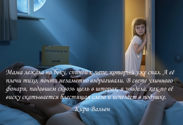 Мама лежала на боку, спиной к папе, который уже спал. А её плечи тихо, почти незаметно вздрагивали. В свете уличного фонаря, падавшем сквозь щель в шторах, я увидела, как по её виску скатывается блестящая слеза и исчезает в подушке. Такая тихая, такая одинокая.