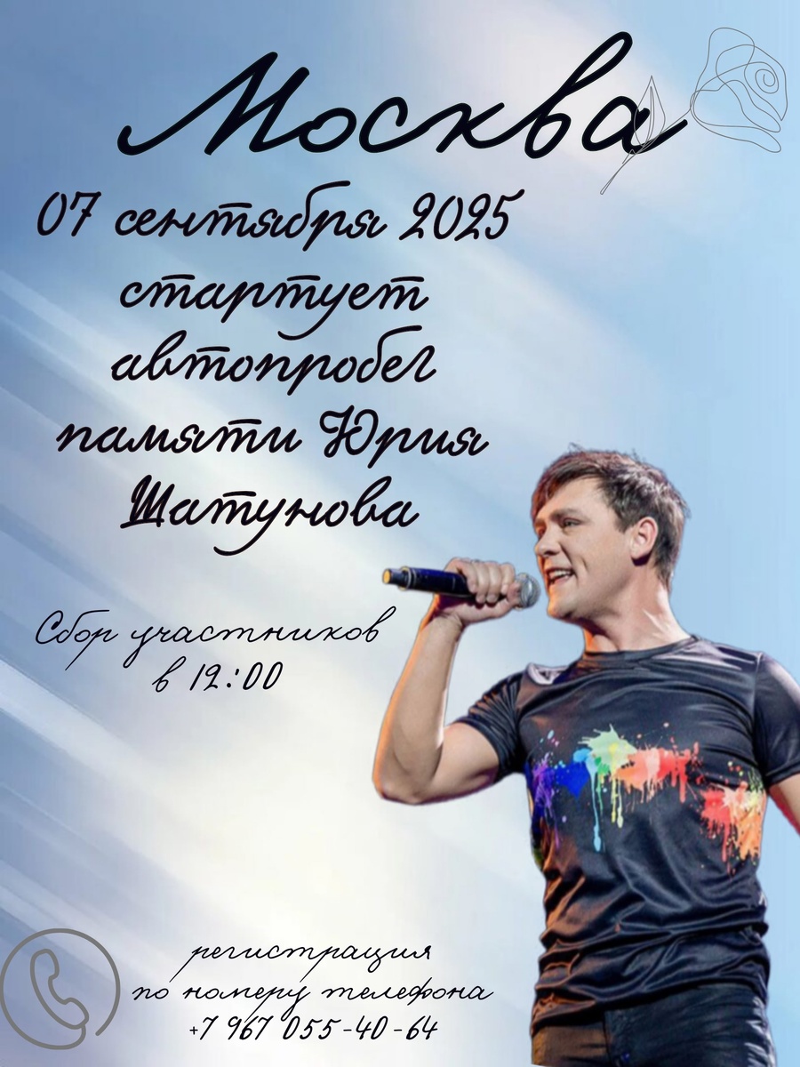 07 сентября 2025 в Москве пройдёт автопробег по памятным местам Юрия Шатунова. Точка старта 🏁 в 12.00 ⭐️Гостиница."Восточная " на Открытом шоссе, где находилась в те времена студия "Рекорд". Именно тут в 1988 году был записан первый альбом "Белые Розы" (Магнитоальбом ). 🚗Мы проедем по Большому каменному мосту, где проходили съёмки клипа "Тающий снег". 🙏 В церкви Успения Пресвятой Богородицы на Могильцах (по адресу: Большой Власьевский пер 2/2, постоим в тишине у иконы Георгия Победоносца.Сия икона вклад о упокоении души Народного певца России раба Божьего Георгия (Юрия Шатунова). ☕️В пути мы выпьем кофе в кофейне, где любил останавливаться Юрий Шатунов. Проедем мимо Телецентра Останкино,где была записана передача "Утренняя почта " с клипом на песню "Белые розы" Высадимся в парке Останкино,где сможем спеть всем известные песни Юры. Увлекательная поездка с любимыми песнями! Присоединяйтесь к памятному автопробегу. Заявки в личном 📩 сообщении. Ждём всех!!!! Запись по номеру т