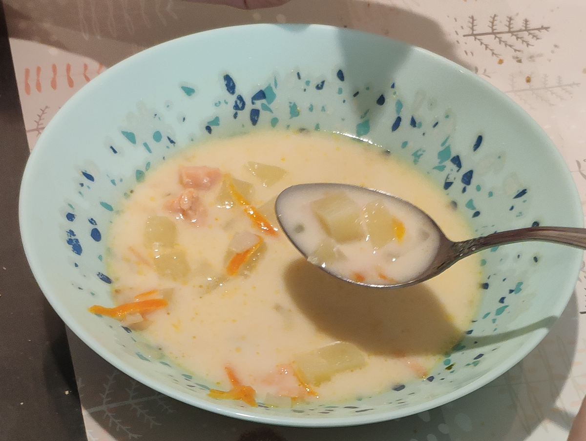 Этот наивкуснейший суп можно варить и из обычной красной рыбы, но из соленой он получается интереснее. Нам понадобится: Вода 1-1,5л Рыба соленая форель или семга – 300г Сливки – 400 мл Вода 1-1,5л Картошка – 3 штуки Морковь – 1 шт Я не солила, т.к рыба была соленой, но по вкусу в конце соль можно добавить Рецепт очень простой. Натираем на крупной терке морковь. Режем кубиками картофель кладем в воду и варим до готовности. Клаем в картофель Морковь, варим минут 5 и кладем порезанную рыбу. Здесь важно не положить ее до готовности картофеля иначе он будет не вкусным. Можно положить зелень по желанию. Далее добавляем сливки, доводим до кипения и снимаем с огня. Дайте супу немного настоятся и приятного аппетита!