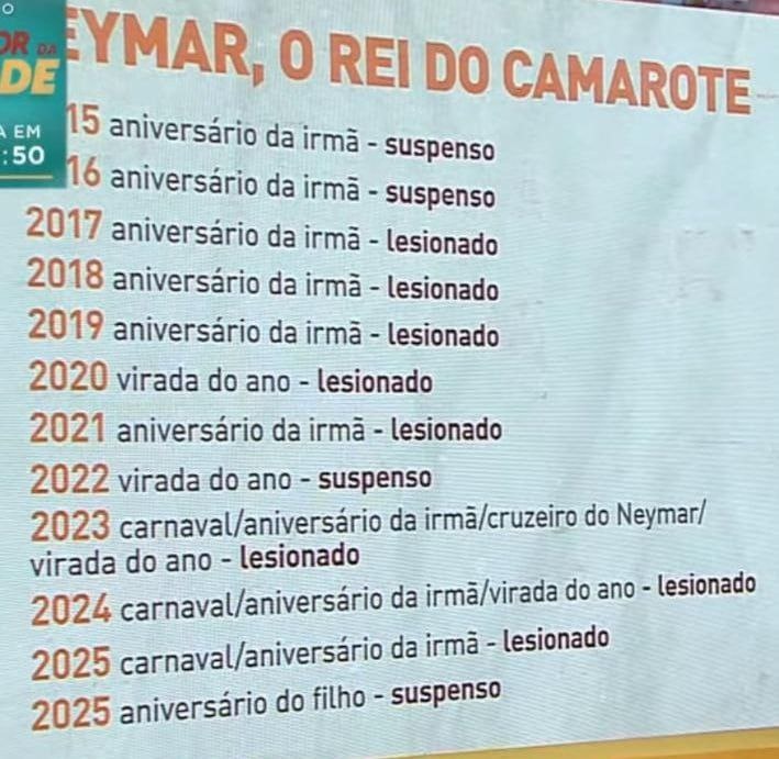 Неймар 10 лет подряд пропускает матчи перед днём рождения сестры, вечеринками и другими гуляниями 2015 – день рождения сестры – дисквалификация 2016 – день рождения сестры – дисквалификация 2017 – день рождения сестры – травма 2018 – день рождения сестры – травма 2019 – день рождения сестры – травма 2020 – Новый год – травма 2021 – день рождения сестры – травма 2022 – Новый год – дисквалификация 2023 – карнавал / день рождения сестры / круиз Неймара / Новый год – травма 2024 – карнавал / день рождения сестры / Новый год – травма 2025 – карнавал / день рождения сестры – травма 2025 – день рождения сына – дисквалификация В последней игре «Сантоса» против «Васко да Гамы» Неймар получил жёлтую карточку и пропустит следующую встречу – в то время, как 14-летие его сына попадает на дату следующей игры «Сантоса».