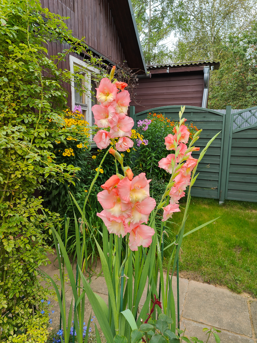 Надоело мне каждый год решать ребус "Куда посадить гладиолусы?" Раньше я пыталась вписать их в цветники. Получалось с переменным успехом. В самом деле, для гладиолусов трудно подобрать адекватное место. Во-первых, они довольно высокие, поэтому растения-соседи должны хоть немного соответствовать их росту. Во-вторых, они хотят расти только на солнышке. Это ещё больше суживает доступные для посадки цветники. В-третьих, их цветки всё-таки довольно специфические, им трудно подобрать компанию, чтобы они вместе с растениями-партнёрами смотрелись гармонично. Но и совсем отказаться от гладиолусов я не могу. Они всё-таки красивые. Цветки крупные, заметные. Окраска самая разнообразная. И вообще их рассматривать интересно. Короче, гладиолусы в саду - ни богу свечка, ни черту кочерга. И не вписываются никуда, и выкинуть жалко. В этом году решила не напрягаться в поисках решения, куда их приткнуть, и высадила просто на грядку. Один сорт, правда, всё же оставила в цветнике. Второй год сажаю гладиол