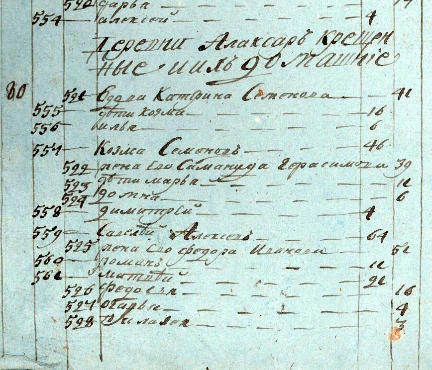 Государственный исторический архив Чувашской Республики. Фонд № 225, Опись № 7, дело № 22. Стр. 2145 скан. Роспись Казанской губернии ведомства Чебоксарского духовного Правления Цывильского уезда села Шигалей Воскресенской церкви священника Фёдора Ионова с причетники обретающимся при оной их церкви в приходе ниже явленных чинов людям, со изъявлением против коегожда имени о бытии их во Святую Четырёхдесятницу у исповеди и Святого Причастия, и кто исповедывался токмо, не причастился, и кто ж не исповедывался сего 1801 года. Стр 2166 скан. Деревни Алаксар крещёные и их домашние. 80. вдова Катерина Семёнова. 41. Дети Козма. 16. Илья. 6. Козма Семёнов. 46. Жена ево Степанида Герасимова. 39. Дети Марья. 11. Домна. 6. Димитрей. 4. Савелей Алексеев. 64. Жена ево Федора Иванова. 51. Роман.11 Матвей. 21. Федосья. 16. Огафья. 4. Пелагея. 3. 81. Степан Матвеев. 39. Жена ево Настасья Иванова. 41. Дети Андрей. 28. Жена ево Ульяна Архипова. 22. Наталья. 22. Марья. 11. Марфа. 10. Игнатей. 13. Мать ев