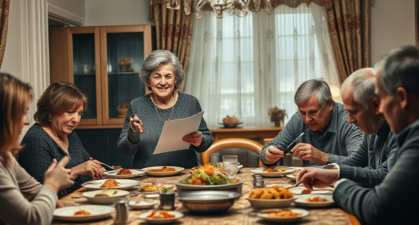 Родственники за столом неловко переглядывались. Тётя Андрея пыталась разрядить обстановку, заговорив о погоде, но напряжение висело в воздухе.