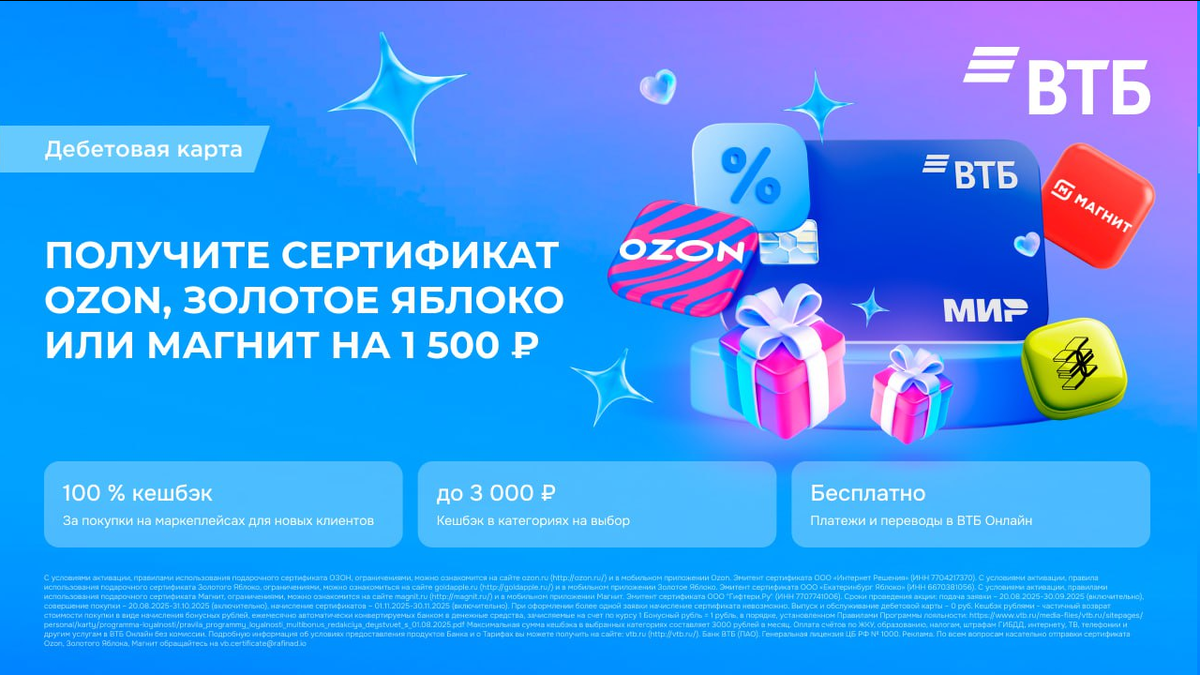🏦 Получаем сертификат 1500₽ на выбор: Золотое Яблоко, Озон или Магнит в подарок с бесплатной дебетовой картой от Банка ВТБ 1. Оформляем именную карту ВТБ по ссылке👉 2. Совершаем покупку на сумму от 500₽ *исключая покупки прописанные в правилах акции 3. Сертификат на 1500₽ в подарок придёт по СМС до 30.11.2025 (один на клиента) Карту можно оформить с 18 лет - До 3000₽ кешбэка в выбранных категориях - 100% кешбэк на маркетплейсы - Бесплатный выпуск и обслуживание - Переводы без комиссии в ВТБ Онлайн *В акции могут участвовать пользователи, у которых в 2025 году не было открытых текущих счетов в ВТБ. При оформлении более одной заявки начисление сертификата невозможно. 👉 оформить карту ВТБ
