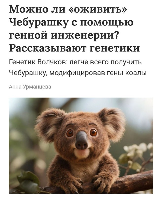 Учёные замутили фокус — из коалы реально можно собрать ЧЕБУРАШКУ. Для этого надо всего лишь подкрутить несколько сотен генов. Главная проблема — выловить нужный ген среди сотен других. Ну и ещё момент: коалы далеко не такие милые, как кажутся. Эти пушистики склонны к агрессии, так что без «перепрошивки» характера не обойтись. В итоге следующий «Чебурашка» может появиться уже без 3D-графики 🥺 Подробнее: https://hard-tm.su/threads/108850/ 🕹HARD-TM — Подписаться