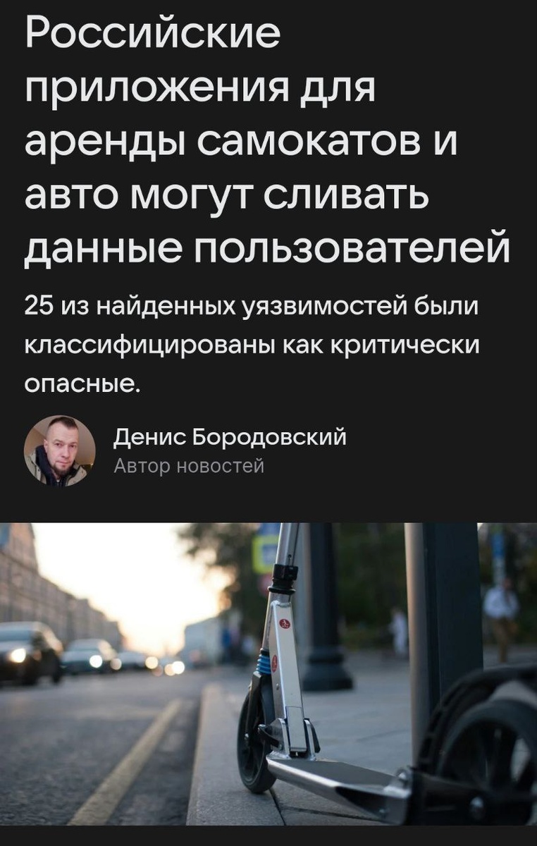 🛴 Российские сервисы аренды самокатов и каршеринга оказались под угрозой масштабной утечки пользовательских данных. Специалисты по кибербезопасности обнаружили свыше 400 уязвимостей в 13 популярных приложениях, при этом 25 из них — критического характера. Через эти брешь мошенники могут получить доступ к личной информации клиентов. • Фото паспорта и водительских прав, загружаемые для верификации. • Данные банковских карт, привязанных для автоматической оплаты. • Историю геолокации и передвижений клиентов. Эксперты настоятельно призывают компании как можно скорее закрыть бреши, а пользователям рекомендуют включить двухфакторную защиту и отказаться от использования открытых Wi-Fi сетей в общественных местах. Теперь даже обычные поездки на самокатах требуют максимальной осторожности.