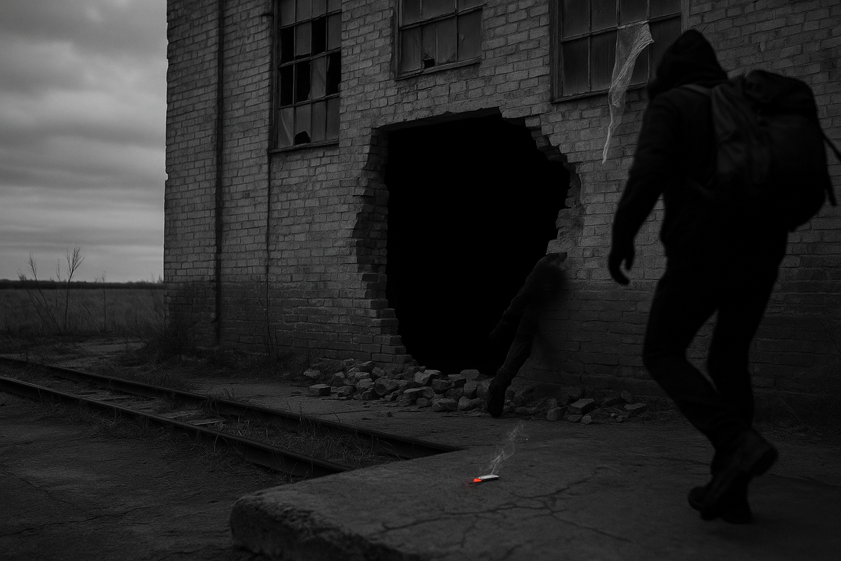«Не надо шептать. Не думаю, что тут кто-то есть», — ответил Мейсон и метнул камень в окно. Стекло разлетелось, и звук разнёсся по всему зданию.