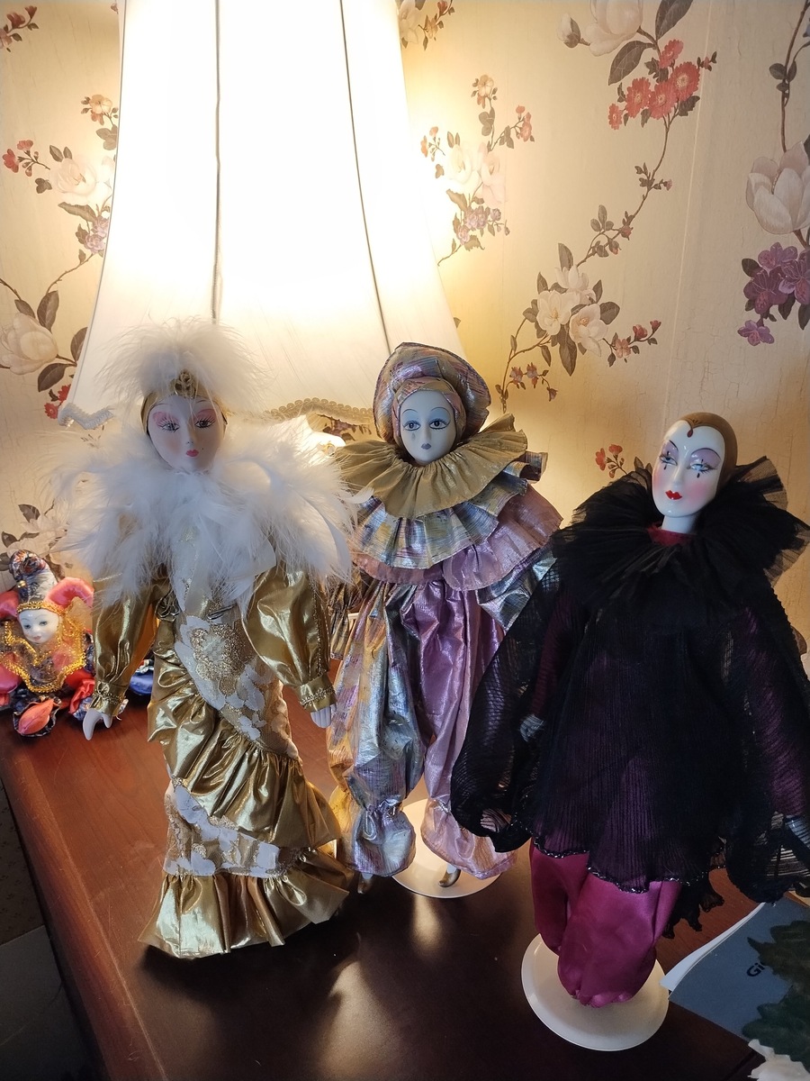 Всем доброго дня! Я недавно стала собирать выставочных кукол из серии "Венецианский карнавал". Сегодня я купила куклу Коломбину и решила наконец сделать с ними фотосессию. В принципе- это стандартные фарфоровые куклы, сделаны по тому же принципу. Голова, руки и ноги - фарфоровые, туловище текстиль. Но вот их наряды!- Ах, эти наряды и образы! Я не хочу их долго описывать- лучше один раз посмотрите, и вы все поймете. Таких кукол у меня пока немного - но это гордость моей коллекции. Может быть и впрямь у меня скоро получится свой персональный кукольный музей. А почему бы и нет. Кукол я собираю разных, и есть очень редкие. Итак встречаем : Вначале общее фото Два маленьких Арлекинчика А вот еще одна очень интересная кукла- вначале я думала что это Санта. Но нет, это особенная кукла, представляющая наверное придворного трубадура, или придворного же шута, но в образе седого старика с длинной бородой. Его наряд просто потрясающе красивый!- бордовый бархатный камзол, отделаный золотом, дли