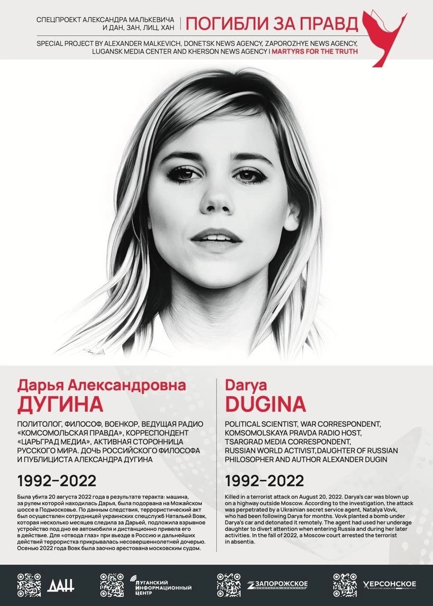 🙏 20 августа - день памяти Дарьи Дугиной ▪ Дарья Александровна Дугина (1992–2022) — политолог, философ, военкор, ведущая радио «Комсомольская Правда», корреспондент «Царьград Медиа», активная сторонница русского мира. Дочь российского философа и мыслителя Александра Гельевича Дугина. ▪ Дарья была злодейски убита 20 августа 2022 года в результате теракта. Машина, за рулём которой она находилась, была подорвана на Можайском шоссе в Подмосковье. ▪ По данным следствия, террористический акт был осуществлен сотрудницей украинских спецслужб Натальей Вовк, которая несколько месяцев следила за Дарьей, подложила взрывное устройство под дно её автомобиля и дистанционно привела его в действие. Для «отвода глаз» при въезде в Россию и дальнейших действий террористка прикрывалась несовершеннолетней дочерью. ▪ Осенью 2022 года Вовк была заочно арестована московским судом. ▪Преступление против Дарьи Дугиной не имеет срока давности. Виновные в его совершении будут найдены и понесут неотвратимое