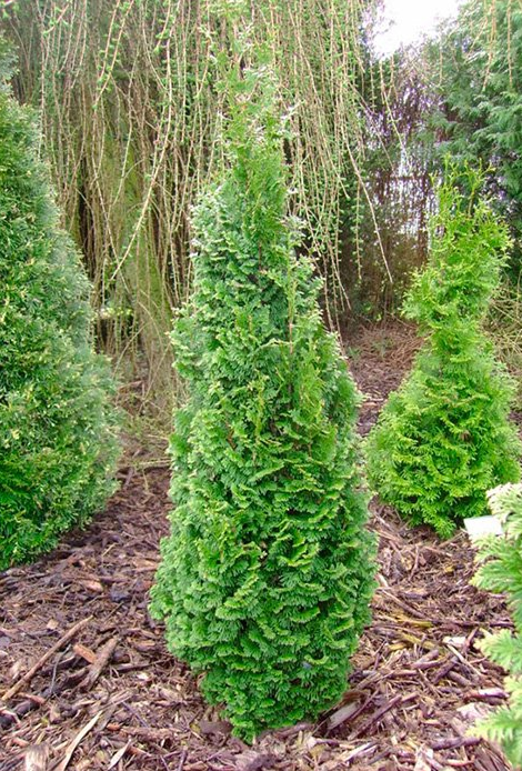 В моем саду в один год изначально рядом на одной клумбе с прелестной золотистой туей и золотистой же елью было высажено 3 растения одинакового сорта - туи западной Спиралисодного возраста и размера, приобретенные в небольших контейнерах высотой не больше 20-25 см.