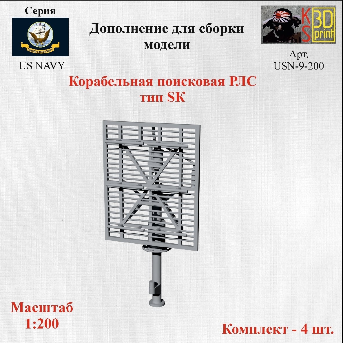 "Картонный самурай" из Москвы выпустила на 3D-принтере модели антенных устройств поисковых РЛС кораблей флота США в масштабе 1/200: Корабельная поисковая РЛС тип SK (4 шт. в наборе) Корабельная поисковая РЛС SK-1 (2 шт. в наборе) Корабельная поисковая РЛС тип SXAM (2 шт. в наборе)