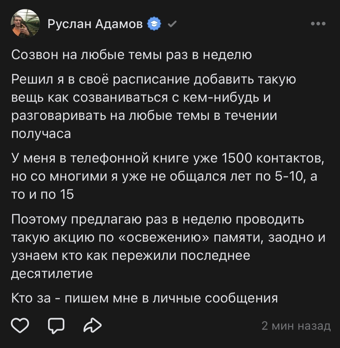 Решил я в своё расписание добавить такую вещь как созваниваться с кем-нибудь и разговаривать на любые темы в течении получаса У меня в телефонной книге уже 1500 контактов, но со многими я уже не общался лет по 5-10, а то и по 15 Поэтому предлагаю раз в неделю проводить такую акцию по «освежению» памяти, заодно и узнаем кто как пережили последнее десятилетие Кто за - пишем мне в личные сообщения